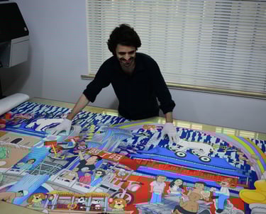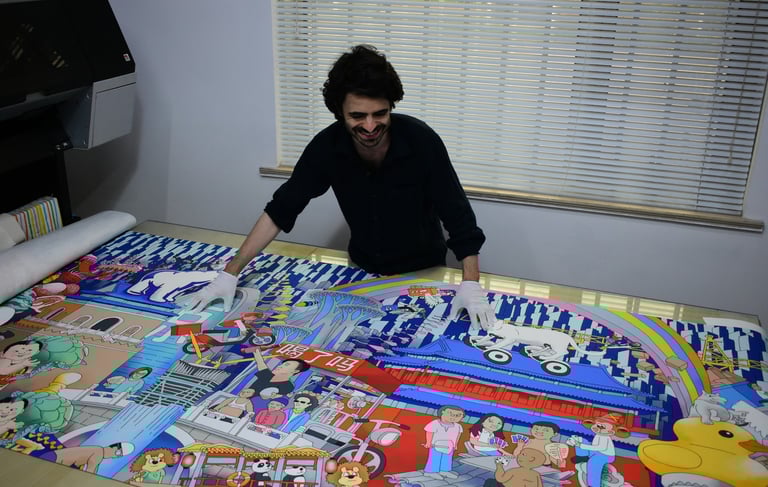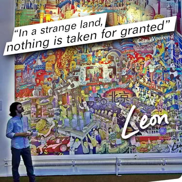Around the world, from Taiwan to Mexico, families, communities, cities and institutions have commissioned Leon to depict their story in his kaleidoscopic style.