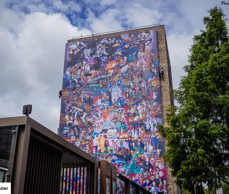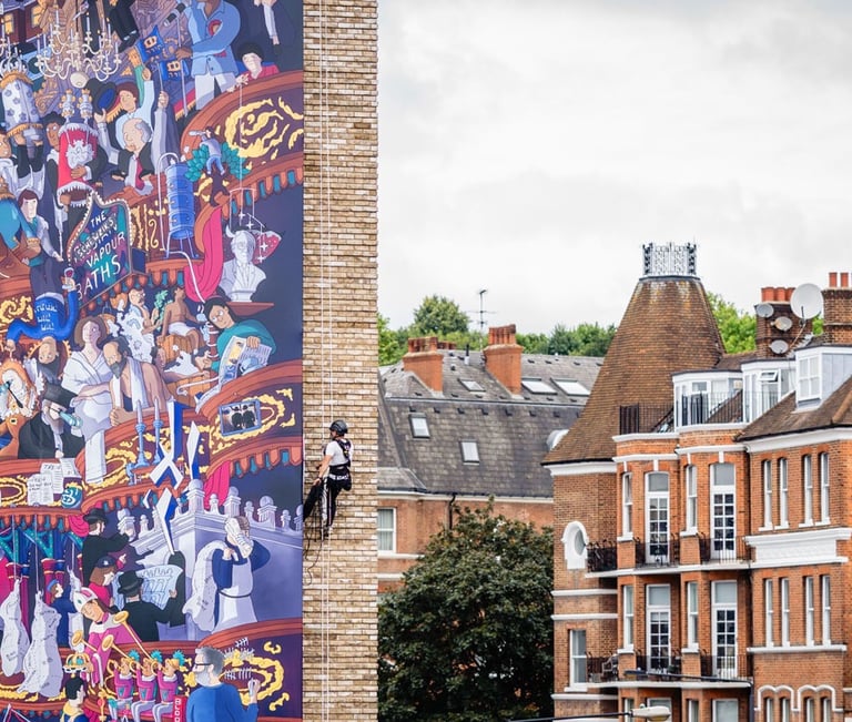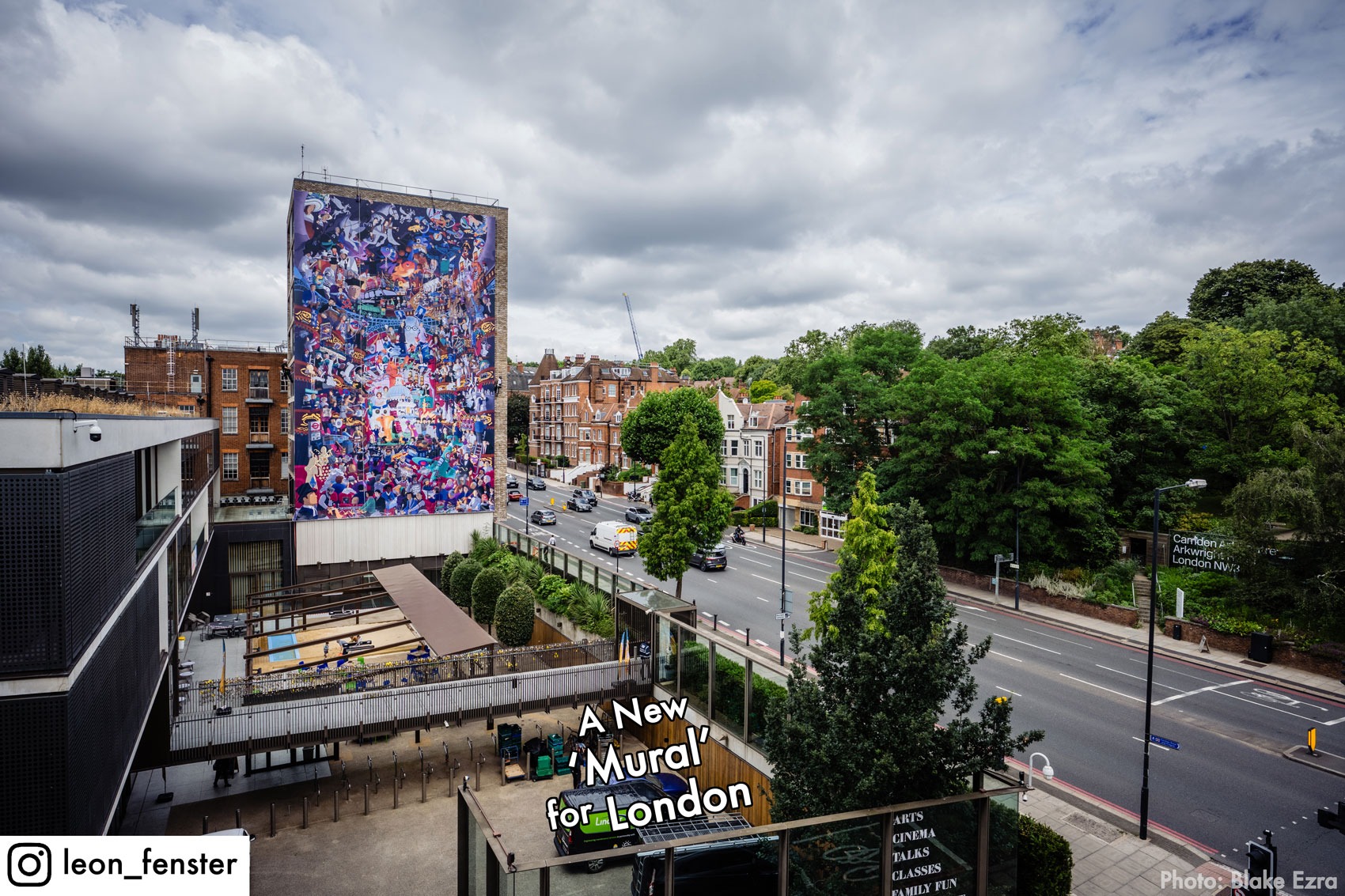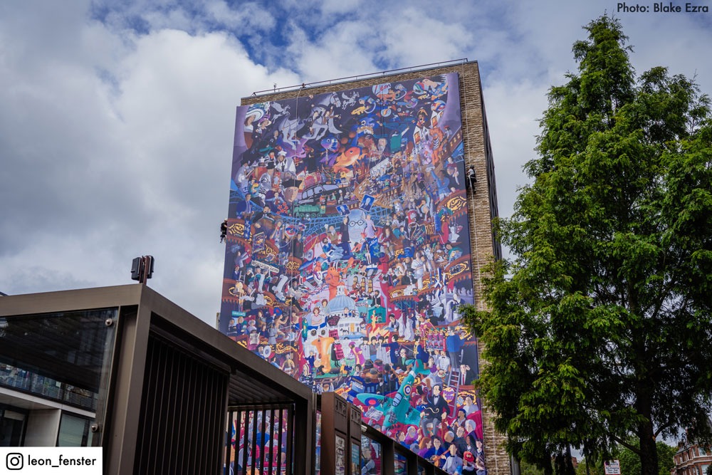 Leon was commissioned to create his vision of Jewish London. The result was a nine-storey high kaleidoscopic collision of stories past and present. @